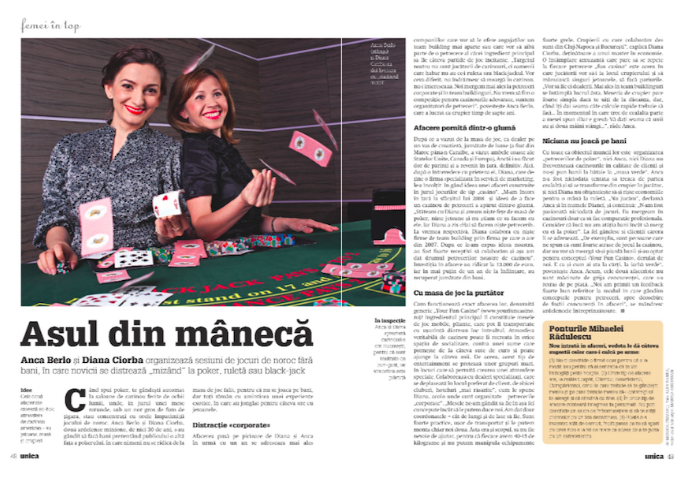 Although their work represents organising “poker parties”, neither Anca, nor Diana frequent casinos as customers, nor do they gamble their money at the “green tables”. Anca was never tempted to cross the side of the table and become a gambler and Diana also does not spend her economies for a spin at the roulette. “We don’t gamble” declaims Anca, both for herself and Diana, and continues: ”I have never had a passion for gambling. I visited casinos just out of professional curiosity.” […] “We have clients who tell us they they are curious about the casino games but do not wish to lose their money so they choose our concept, ‘Your Fun Casino’ ” tells Anca. Now, the two business ladies are not worried about competition, since it withdrew from the market… “We have received excellent feedback for the way we imagine the event and party concepts, in comparison to our ex competitors” pride themselves the two entrepreneurial ladies from Ardeal.